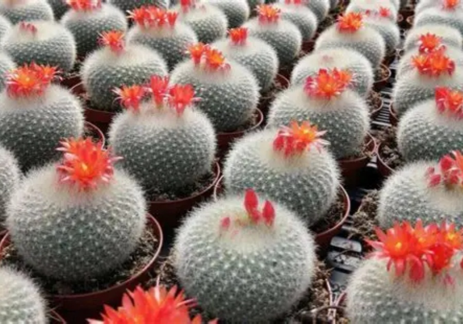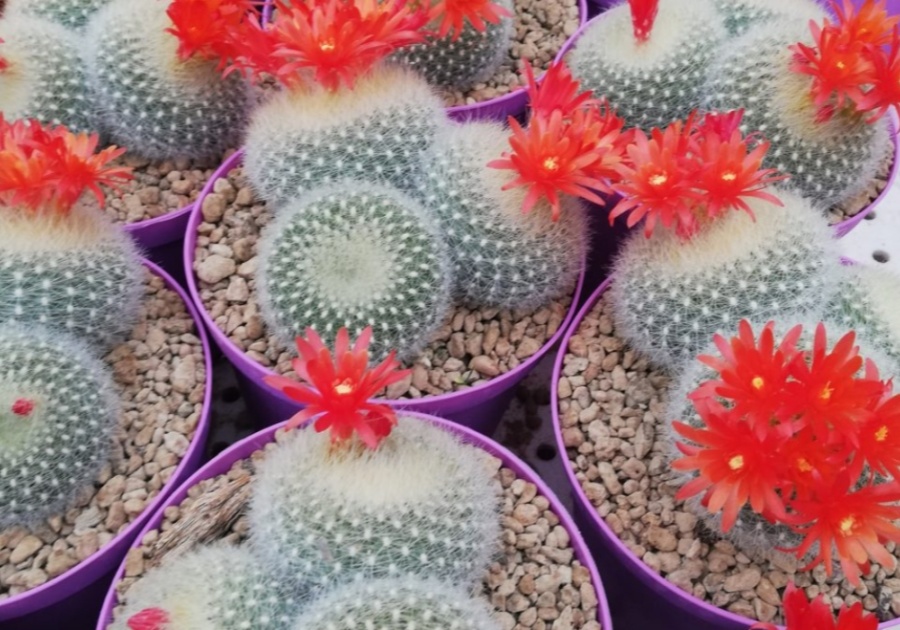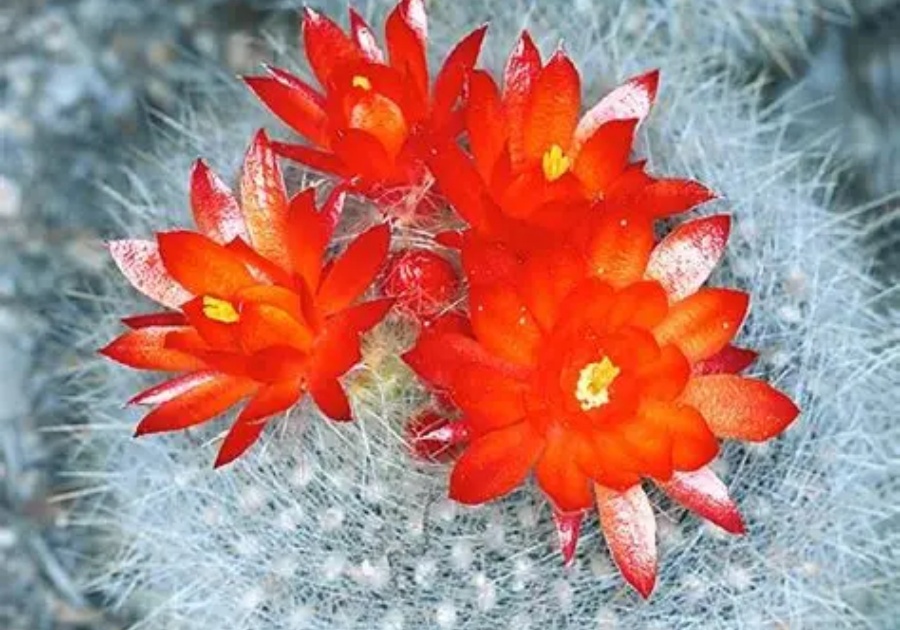 白雪光仙人球花色为橙色、红色、黄色。花着生在顶部刺座,花瓣外部红色,内部火红或橙红色,