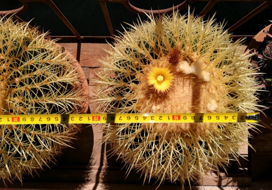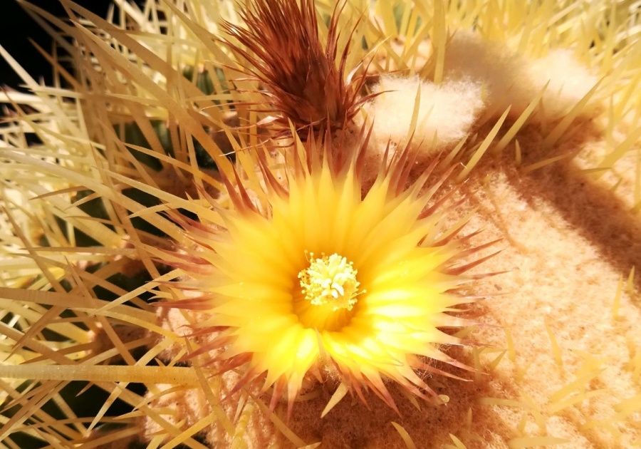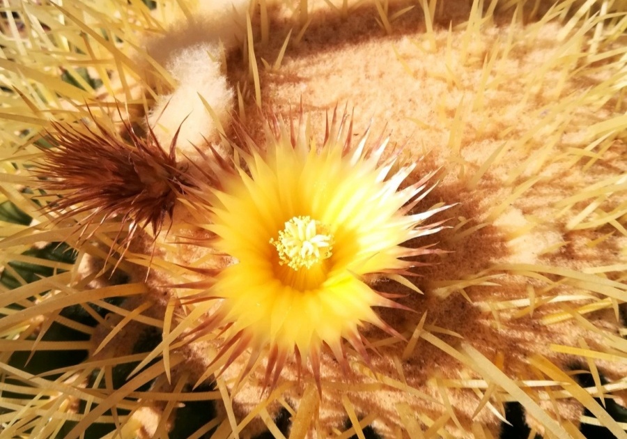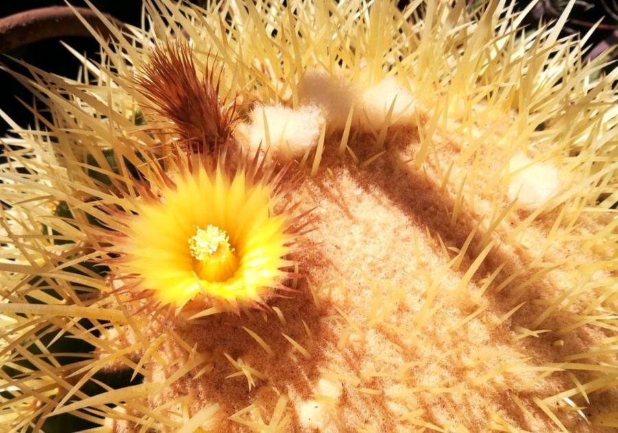 当金琥仙人球达到20多厘米的直径时,植物在良好的条件下会开始开花。黄色的花着生于金琥仙人球顶部的绵毛丛中。