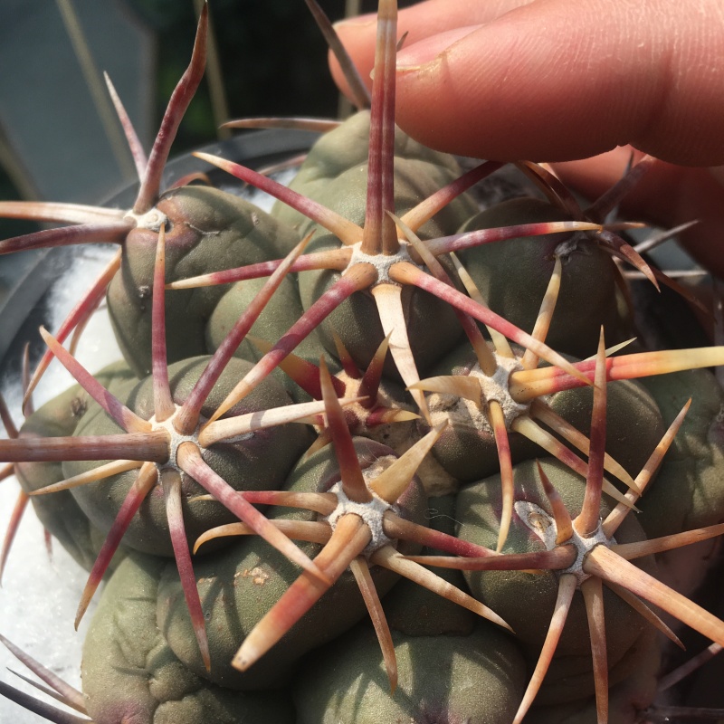 瘤玉属大红鹰仙人球Thelocactus heterochromus也叫红鹰仙人球,是瘤玉属比较经典的品种。大红鹰仙人球看起来和大统领差不多区别在于大红鹰中间的刺比大统领要粗,刺座上没有什么凹槽,而大统领中刺细,且刺座上有凹槽。大红鹰仙人球球体比较大,疣凸也较大,中刺长且有点扁,新刺紫红色, 漂亮。大红鹰仙人球花开的 漂亮且大,花朵直径4-8cm,颜色绢粉红,于5-7月开花。