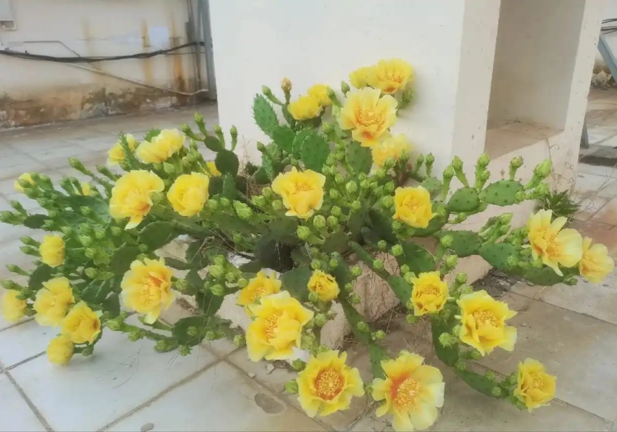 记得小学四年级的时候,母亲从邻居家要来一小块翠绿的长满毛刺的仙人掌,栽到院子里的一块空地上。自打栽上 没再管过它,春夏秋冬无人问津的日子它疯狂的生长,叶片越来越多,占地面积也越来越大,直到母亲觉得它有些碍事了,想把它们全都砍掉。 在这时,它竟然开出了许多暖黄色的花,远看一排排厚厚的绿色叶片上点缀着黄色的花骨朵, 别漂亮。
