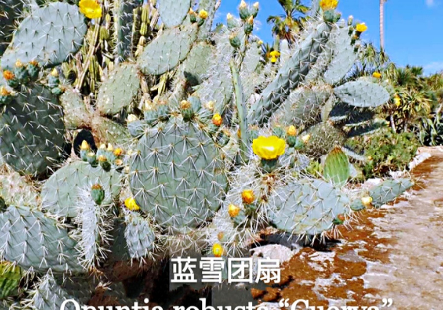 描述:强性团扇蓝雪是仙人掌科仙人掌属的多肉植物,掌体蓝色,直立生长的 一种大形仙人掌,开黄色花,耐寒性能好。强性团扇蓝雪Opuntia robusta ‘Cuerva’是典型的强性团扇Opuntia robusta的一种变种,蓝雪仙人掌的 点是掌片较小,刺较多,但也具有 大的活力。强性团扇蓝雪掌片带粉,强刺掌,后期老掌刺会变卷,灿烂的仙人掌开花标本。尤其令人惊叹的是,在蓝色的绿色“桨”的映衬下,银白色的脊骨给人一种近乎雕塑般的质感。光线好的环境下强性团扇蓝雪呈现蓝白色肌肤,配上白金大刺,如高山雪莲般出淤泥而不染,濯清涟而不妖,故名蓝雪。