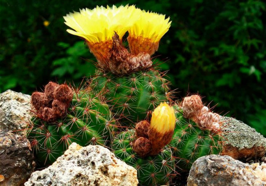 花色:黄色,夏季球体顶端绽放金黄色花朵,花瓣呈莲花座排列,雌蕊呈红色,单朵花期3-5天,每日午后闭合次日再开;