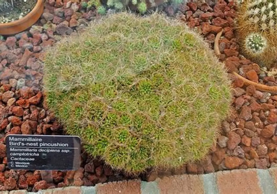 Mammillaria decipiens subs. camptotricha cv. Bru:(又名 forma brevispina)身体呈淡绿色,有 4 至 5 个 短的金色径向刺。