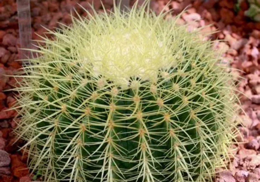 刺:金琥刺座很大,密生坚硬的刺呈金黄色,后变褐,有辐射刺8~10,长3cm,中刺3~5、较粗,稍弯曲,长5cm。金琥仙人球顶部有多数浅黄色羊毛状刺