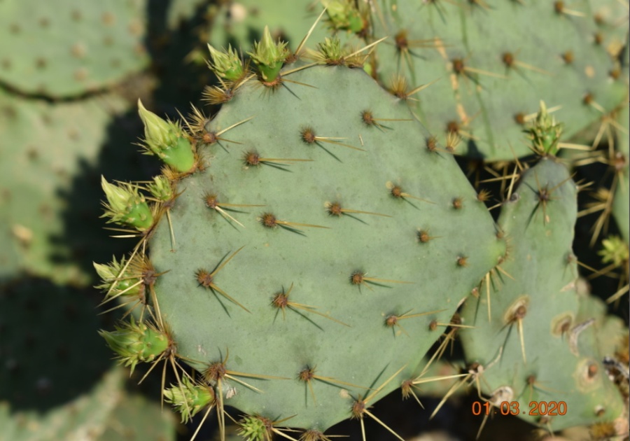 形态:恩格尔曼仙人掌是仙人掌科仙人掌属的一种灌木状或树状仙人掌,成熟植株通常可长到3-6英尺高和宽(90-180厘米)。扁平的茎节呈圆形至倒卵形,菱形,可长至40厘米,宽30厘米。它会形成较大的簇状生长,生长时可直立生长,有时向外扩散。