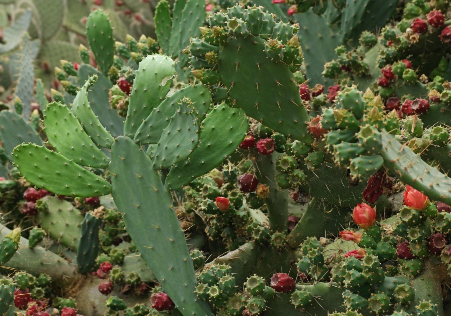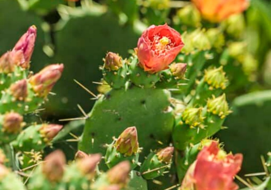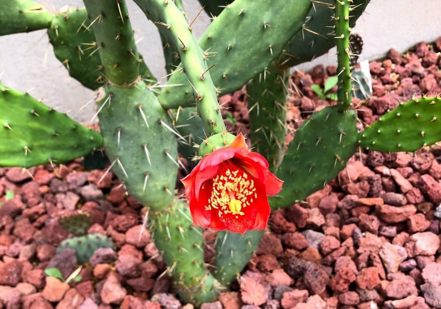形态:沙尘团扇是一种强壮的灌木品种,它可以长成 4.5米高的仙人掌树,掌片繁多,生长迅速。这种仙人掌在很小的植株上也会开出大量鲜红色的花朵。