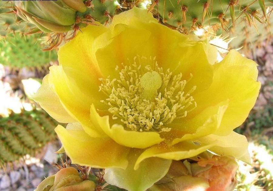 花:刺叶仙人掌的花通常是黄色或橙色,但花被片背面中脉可能呈橙色,花药颜色较浅,花柱为淡奶油色,柱头叶片呈绿黄色。每朵花通常呈杯状,色彩鲜艳,吸引蜜蜂等多种传粉者,