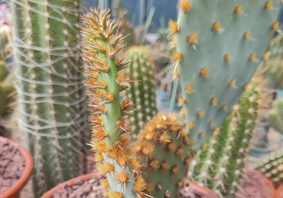1、金刺花火团扇,开红花,顶部边缘处刺座密集,刺是金黄色。刺毛的颜色从黄色到棕色不等,针状、向外扩展的刺长度3-8毫米,形成密集簇。(花火团扇变种,晓阳猜测金刺花火团扇与红刺花火团扇是同一个品种,刺的颜色是花火团扇不同状态下的外在表现,新生掌片的刺呈现出金红色,成熟掌片的刺呈现出金黄色);