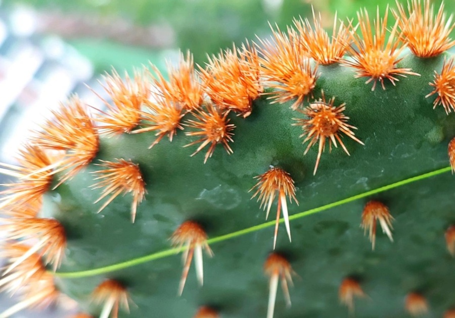 2、红刺花火团扇,开红花,新生掌片的刺是金红色。刺毛呈浅红色至深红棕色,有时顶端带有黄色,体长3-8mm。(花火团扇变种,晓阳猜测金刺花火团扇与红刺花火团扇是同一个品种,刺的颜色是花火团扇不同状态下的外在表现,新生掌片的刺呈现出金红色,成熟掌片的刺呈现出金黄色);