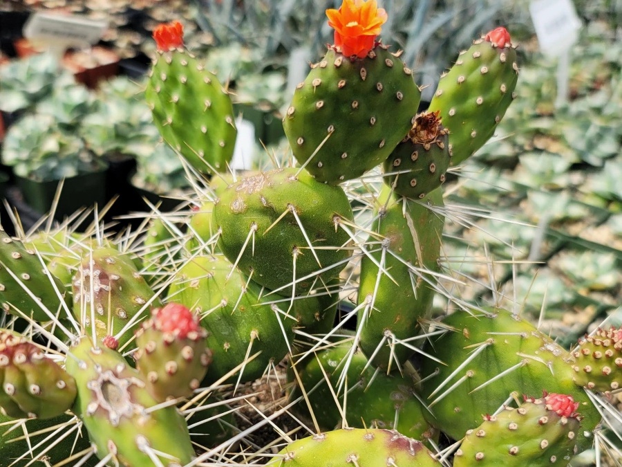 描述:情人团扇是仙人掌科仙人掌属的一种多肉灌木,其主要生长在季节性干燥的热带生物群系中。情人团扇有时会产生神奇的“顶生花”,这些花嵌入扁平的叶片中,取代生长点,形式一枚枚花色纽扣按在仙人掌上。情人团扇仙人掌是蔓延生长、有点直立的多肉灌木丛,有单茎,但形成通常 0.4-2 米高的大灌木丛,但在茂密的植被中变得相当高(高达 3 米)。