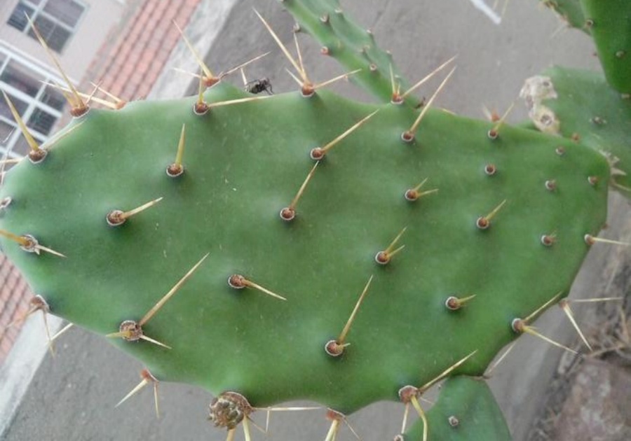 黄大刺仙人掌是一种常见的缩刺仙人掌Opuntia stricta,是仙人掌科中极具辨识度的品种,黄大刺仙人掌名称直接源于 的形态 征(刺座部位丛生着黄色尖利的大刺的仙人掌)。黄大刺仙人掌生长在荒漠和半干旱地区,外表 ,又称为“金刚刺”、“钻石仙人掌”,广受人们的喜爱。这些尖刺不仅是它的 “防御武器”,也是其标志性符号,阳光下泛着明亮的黄色光泽,长度可达 3-5 厘米,坚硬锐利,让人望而生畏。不过,这一 征并非一成不变,在室内光照不足的环境中,它的刺会变得短小纤细,甚至几乎不生长,此时表皮油绿光滑便成为了识别它的重要依据。即便失去了标志性的大刺,其肉质茎片依然保持着饱满厚实的质感,表皮如打蜡般富有光泽,浓绿中透着生机,给人一种健康茁壮的视觉感受。