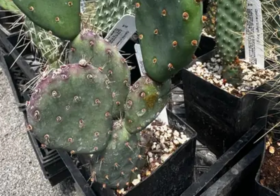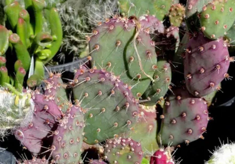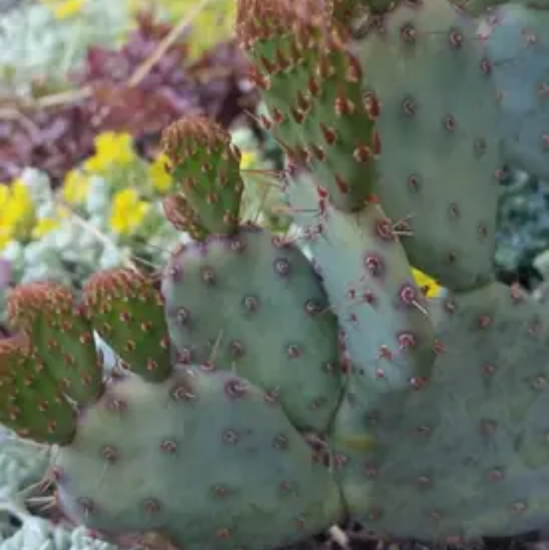 形态:小丽塔仙人掌垫子呈圆形至椭圆形,在凉爽的温度或充足的阳光下呈柔和的紫色和粉红色,新的掌片通常显示出充满活力的洋红色调,掌片具有季节性颜色变化。小丽塔是耐霜冻仙人掌中颜色 美丽的形式之一,是一种紧凑型仙人掌,长 2 英尺,垫子长 3-4 英寸,掌片呈蓝绿色,通常老化为黄绿色,这是一种自然现象,并不表明缺乏肥料。春天小丽塔仙人掌被晚霞色的花朵覆盖,植株是迷人的紫色,到冬季颜色变为紫色。