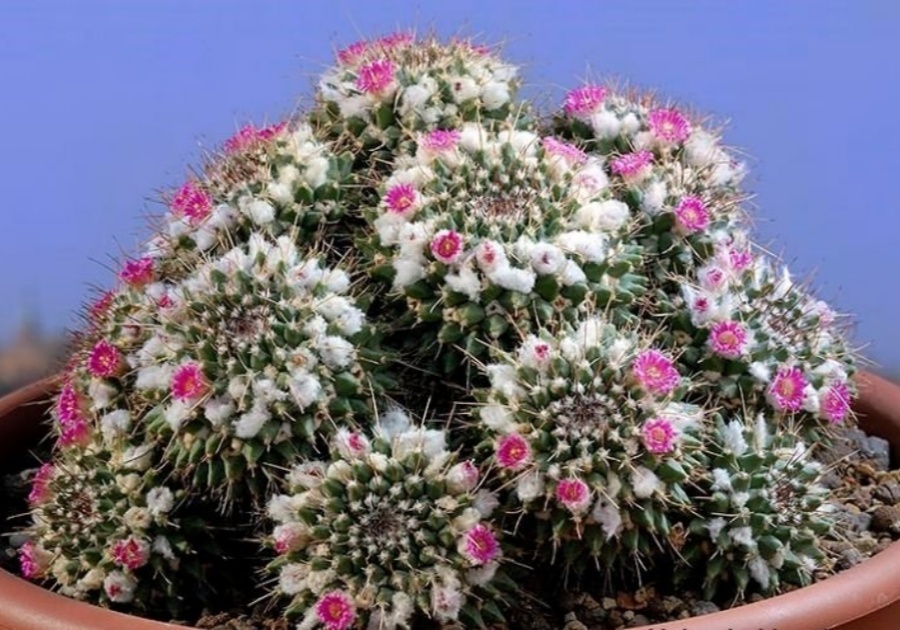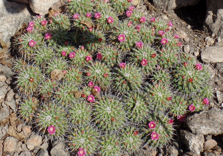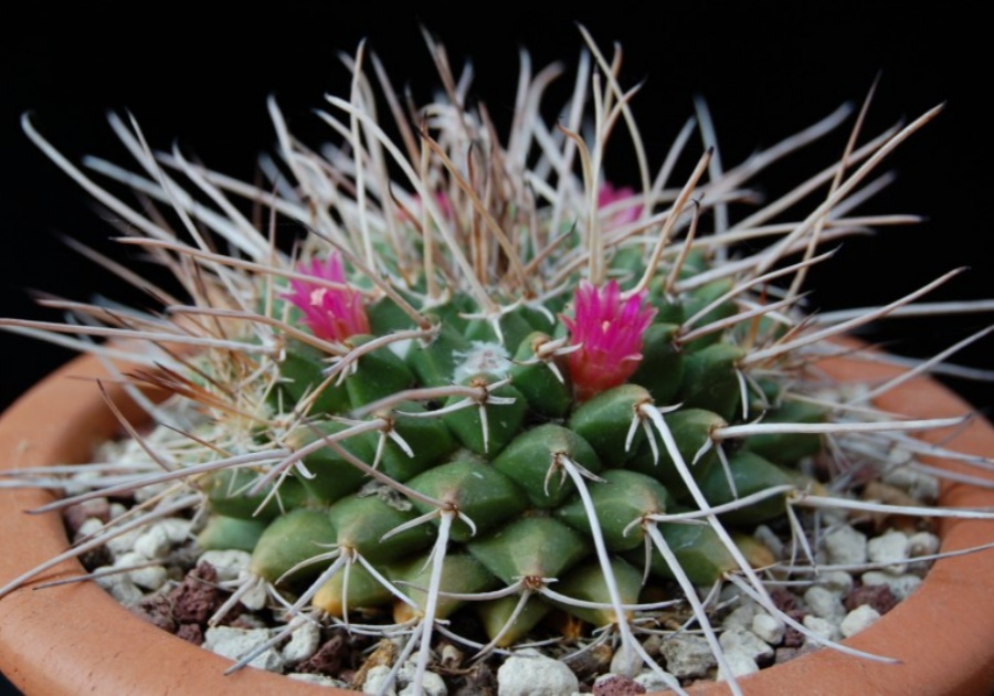 描述: 白龙球是仙人掌科乳突球属强刺类多年生肉质植物,原产于墨西哥中部沙质土壤及岩缝环境。 白龙仙人球生长速度快,呈丛生多浆灌木形态,茎部球形至棒状,表面淡灰绿色且覆盖白色绵毛,疣状突起短粗并具放射状刺群;花期春夏季节,粉红色钟形花朵环状排列于球体顶部。 白龙仙人球生长习性表现为耐旱性强,喜疏松透气的沙质土壤,忌水涝与严寒,冬季需室内越冬,适合通过扦插繁殖子球。