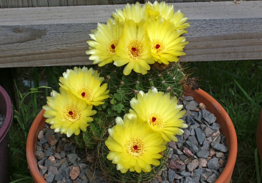 花色:黄色,夏季球体顶端绽放金黄色花朵,花瓣呈莲花座排列,雌蕊呈红色,单朵花期3-5天,每日午后闭合次日再开;