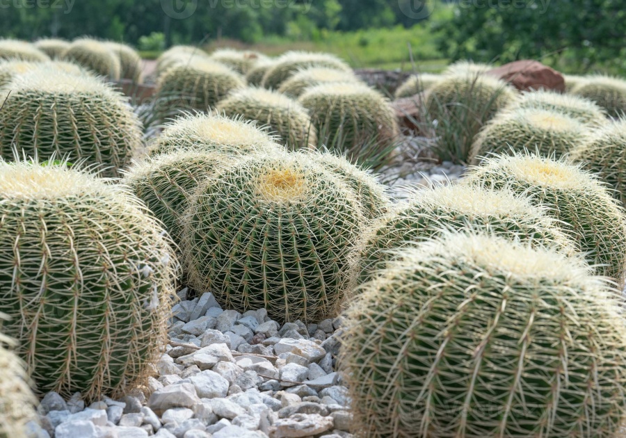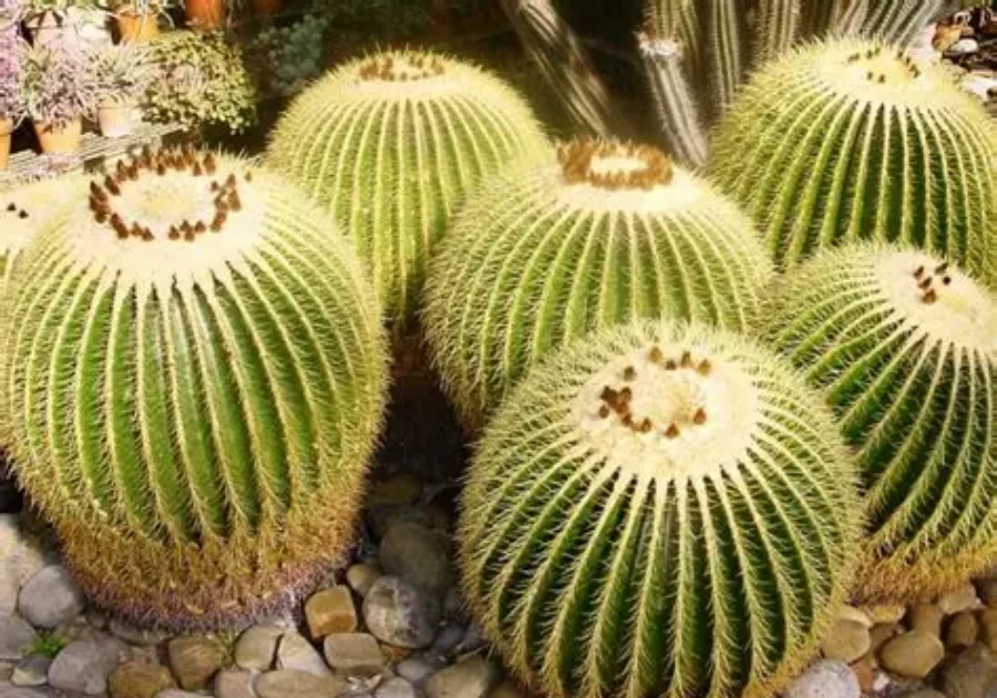 大龙冠 - Echinocactus polycephalus,植株球形或筒状,丛生,高80cm,直径25cm,刺黄或红色。