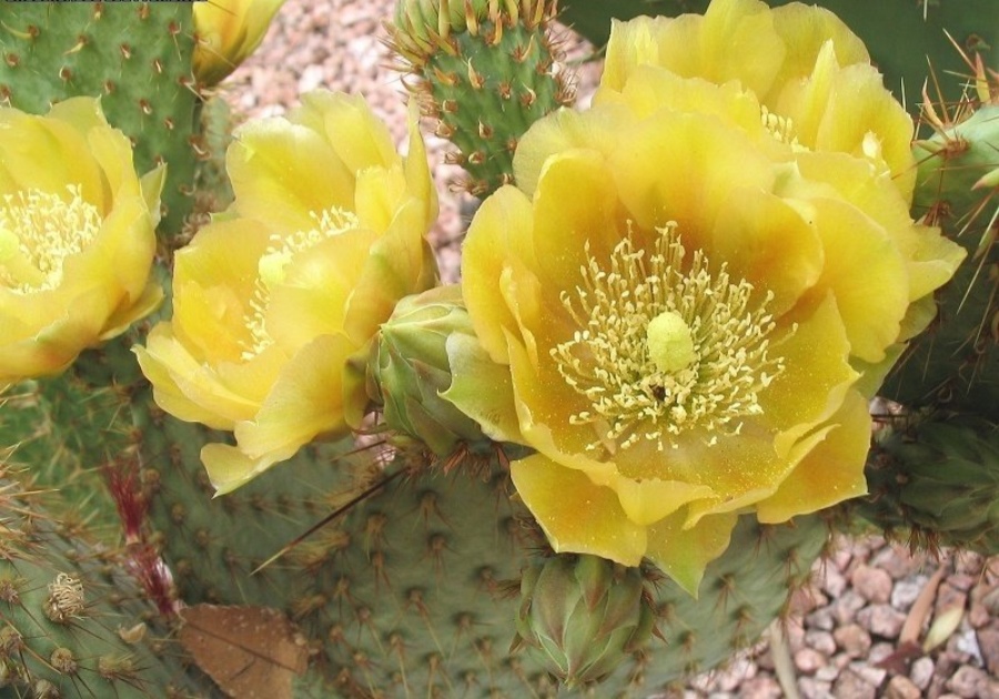 花:刺叶仙人掌的花通常是黄色或橙色,但花被片背面中脉可能呈橙色,花药颜色较浅,花柱为淡奶油色,柱头叶片呈绿黄色。每朵花通常呈杯状,色彩鲜艳,吸引蜜蜂等多种传粉者,