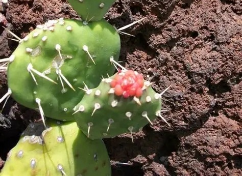 果子:情人团扇仙人掌果倒卵形至桶状,深脐,棕绿色至红色,几乎无刺,长约2-4厘米,直径2-4厘米,有球状体,有时有刺或刚毛。情人团扇花是功能性无性花,如果需要果实和种子,则需要同时种植雄性和雌花两种。
